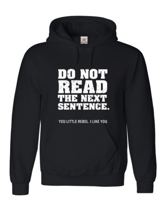 "Do Not Read The Next Sentence. You Little Rebel, I Like You" Text In White Ink on Black Hooded Sweat