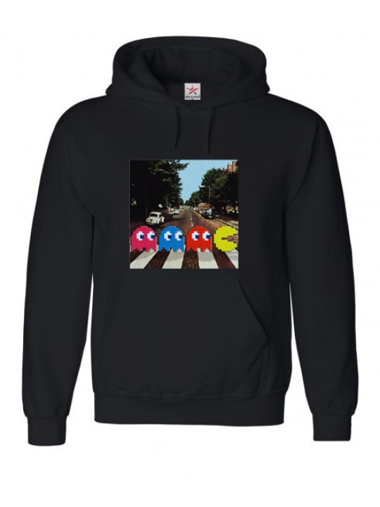 This is a Printed Black hoodie with the logo of the famous game Pacman walking on Abbey Road Printed Logo Hooded Sweat In Black , the Pacman logo is centred in front of the hoodie so it is clear to view, The is printed logo of Pacman on the famous Abbey road. Ideal just to wear causally when your out or at home or where ever you choose to wear it. The fabrication is 80% cotton and 20% polyester comes in a range of sizes to choose from. This top is very comfortable to wear and will keep you nice and warm. Also ideal to wear in hot weather.